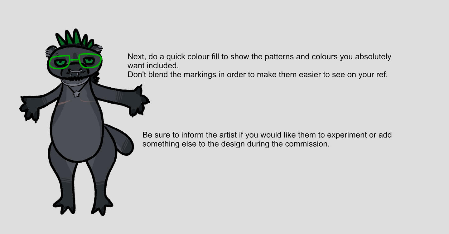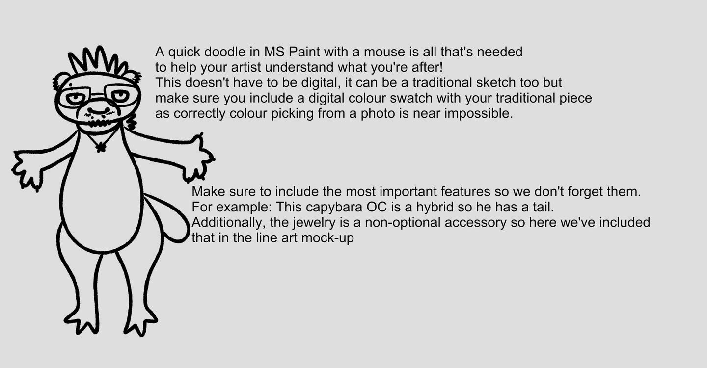 At least one of the reference images MUST be flat coloured. If a flat colour reference is not able to be provided, please have the RGB codes or a screen shot of the exact colour swatch from Google for the correct shades. CaffeineHazard is unable to change and re-colour completed and approved commissions.As it is easy to misinterpret what the client is asking for without a visual reference, please make sure to use as much detail as possible when describing your character or quickly doodle up a reference using a free template to better assist me in bringing your character to life <3Below is a handy tutorial on how to doodle something yourself and Here’s some free anthro and pony templates to fill in if needed!Please have ALL information for your character ready before commissioning to prevent longer wait times for other clients.